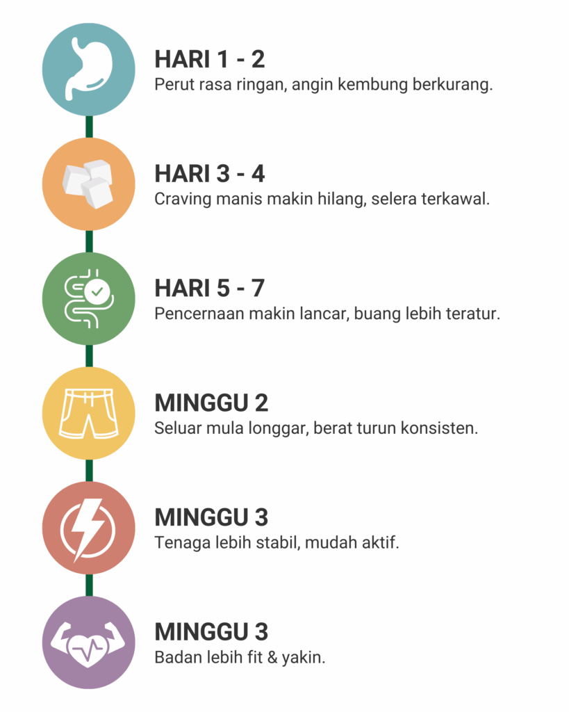 Perut lebih ringan & turun 2–5kg dalam 1–2 minggu.