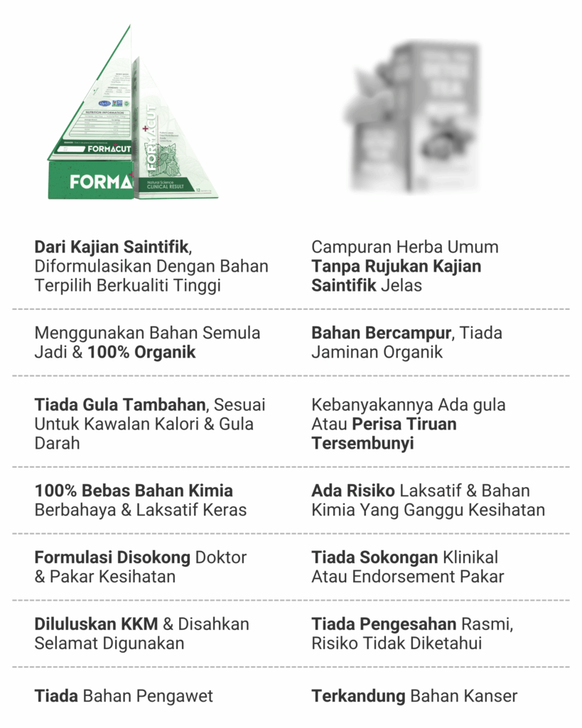 Perbandingan jelas kenapa Formacut lebih selamat, berkesan, dan dipercayai.