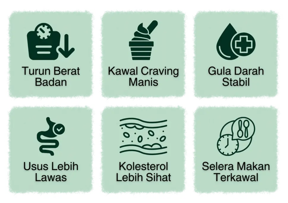 Mengurangkan penyerapan gula berlebihan ke dalam darah — craving makin terkawal.