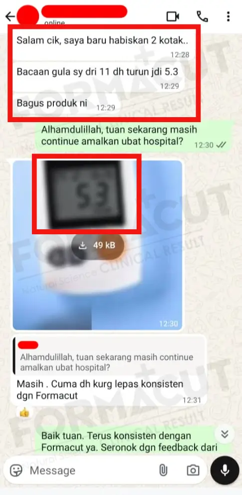 Bacaan Gula Dari 11 → Turun ke 5.3 hanya dengan 2 kotak! 🔥Formacut+ memang power untuk stabilkan gula cepat.”